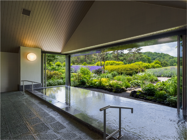 大きな窓からは四季を感じる風景が広がる天然温泉。湯船に浸かりながら、軽井沢の美しい移ろいや季節の花・自然を心ゆくまでお楽しみください。疲れた体を解きほぐす至福の時間をお届けします。