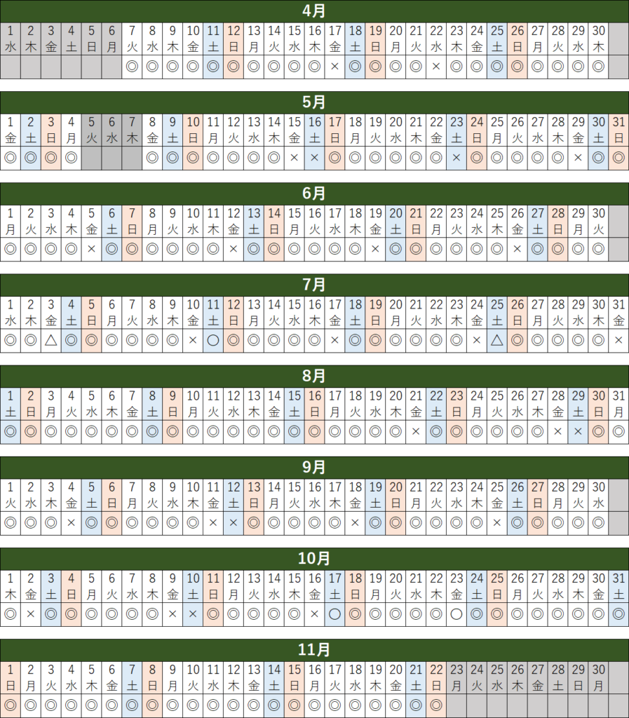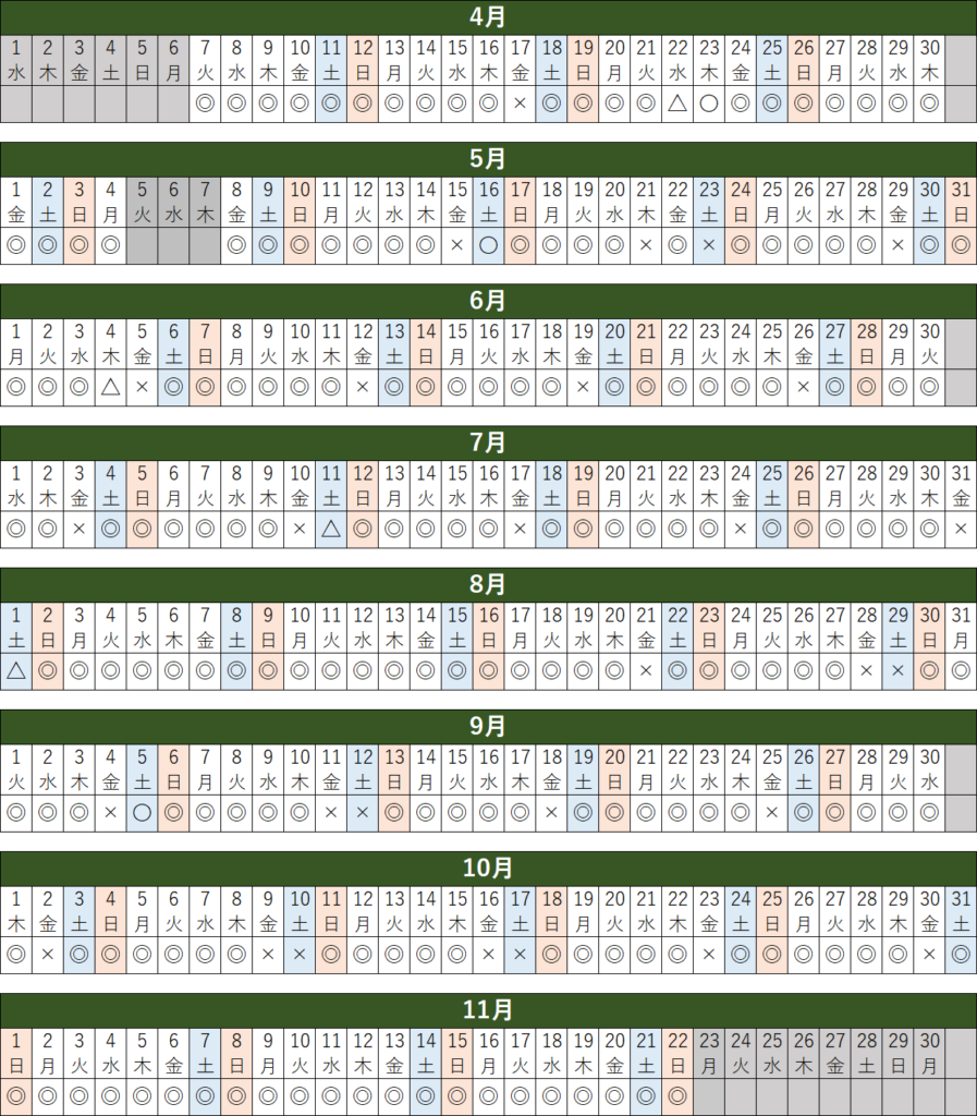 マークの説明◎:8室以上空きがあります〇:4室以上空きがあります△:4室未満空きがあります✕:空きがありません※プレーの空きがない場合がございます。※シングルルーム・ツインルームの室数をカウントしております。