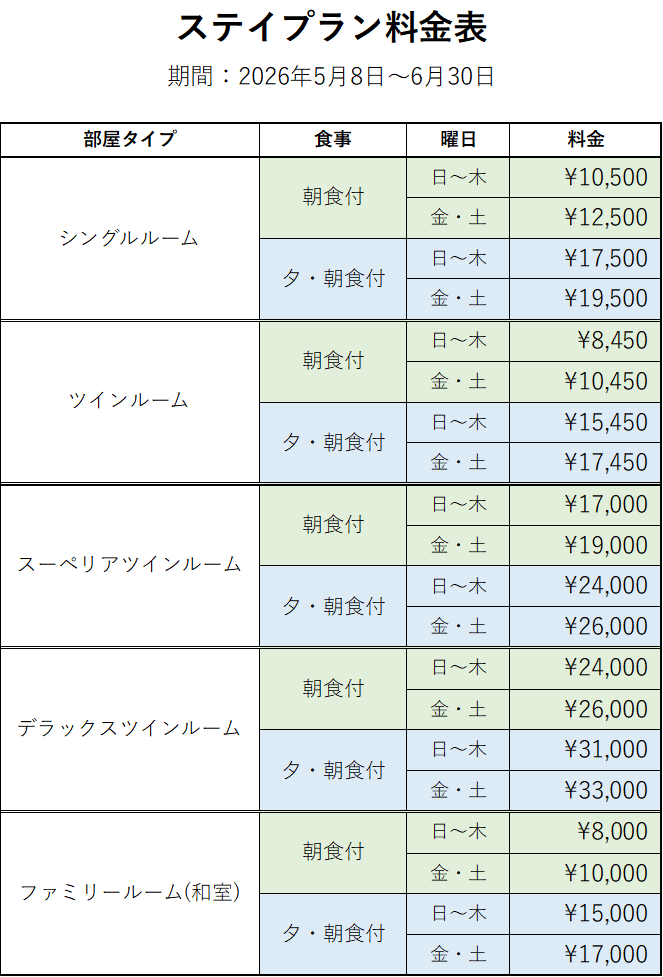 ※ツインルーム(2名利用)および和室(4名利用)それぞれの、1名様あたりの料金となります。